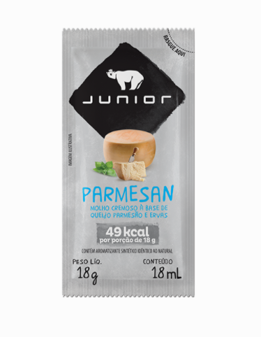 Sachet Molho cremoso à base de queijo parmesão e ervas, Junior – 18g. Caixa com 180 unidades.